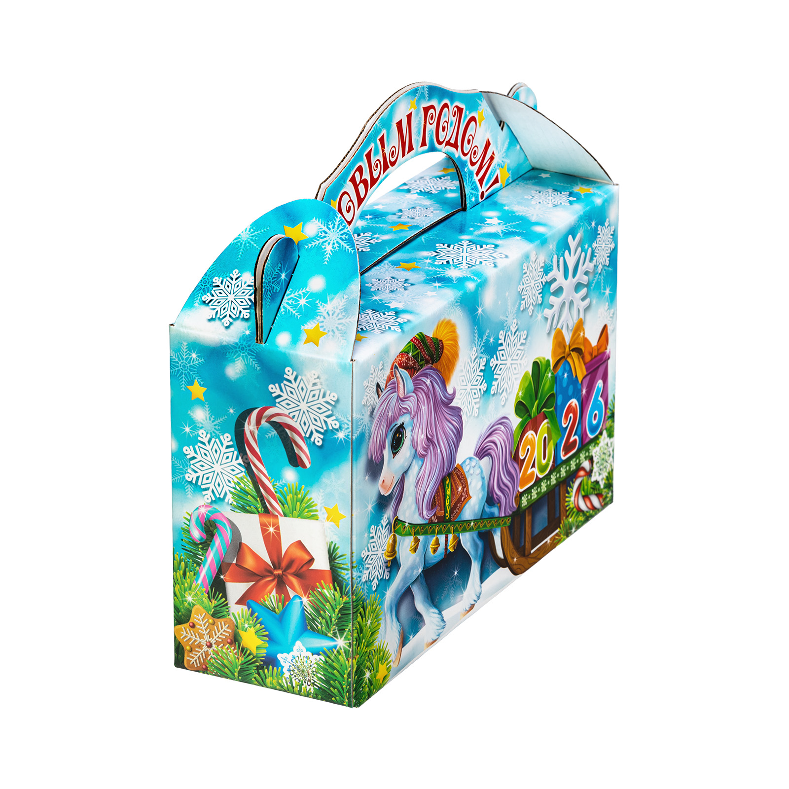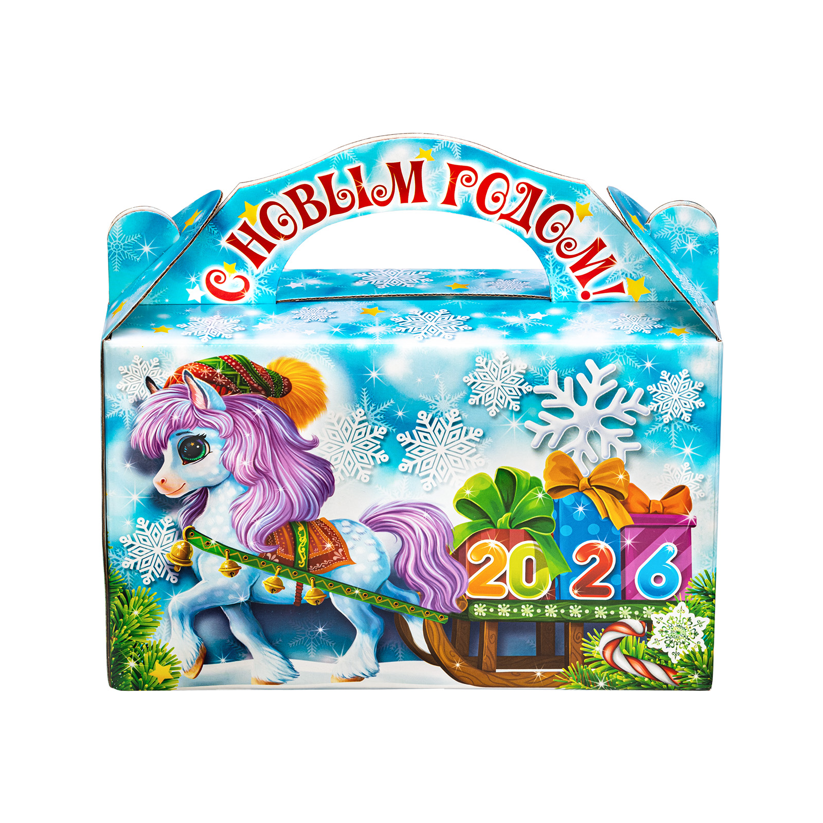Новогодний сладкий подарок с изображением символа года - это универсальный подарок, который подойдет сластене любого возраста. “Сладкие сани” -это небольшая картонная коробочка нежно-голубого цвета, украшенная со всех сторон разными зимними узорами. На передней части изображена волшебная лошадка с фиолетовой гривой. Она везет упряжку с подарками, на которых обозначены цифры наступающего года. Сверху расположена удобная ручка с поздравительной надписью. Подарок состоит из килограмма отборных сладостей и небольшого памятного сувенира с изображением символа года.