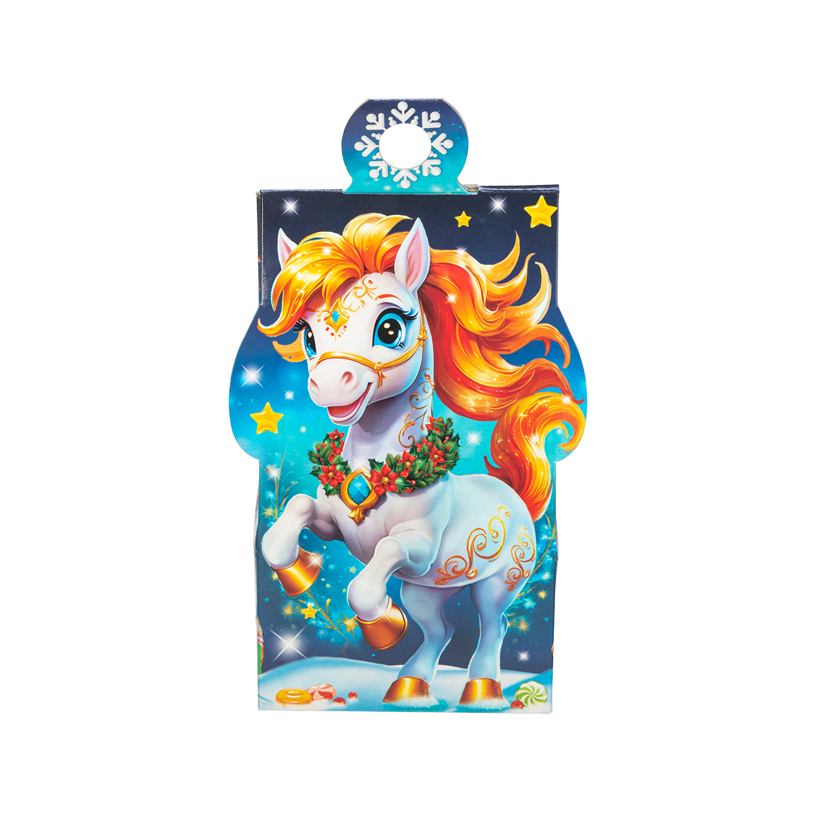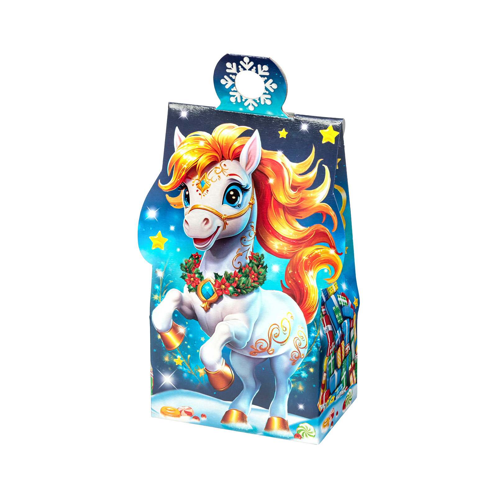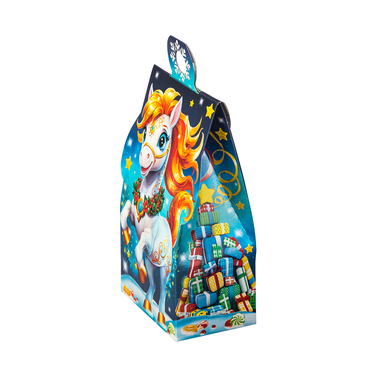 Этот небольшой подарочный набор в красочной картонной упаковке - самая настоящая находка! Упаковка выполнена в виде небольшой сумочки, украшенной яркой новогодней иллюстрацией. Спереди мы видим неутомимую игривую лошадку, которая прискакала из своей волшебной страны и привезла с собой множество угощений для своих друзей. В состав подарка входит 400 грамм отборных сладостей, которые порадуют абсолютно любого ребенка. Этот подарочный набор идеально подойдет для новогоднего мероприятия в начальной школе или детском саду.